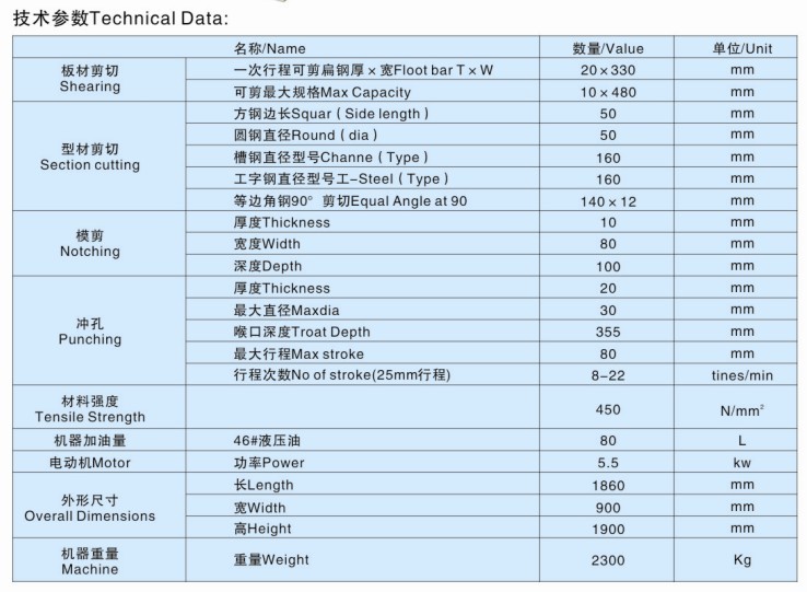 液压联合冲剪机采用液压传动,是目前国内联合冲剪机最新产品,能对板材、方钢、圆钢、角钢、槽钢、工字钢进行剪切、冲孔、模剪,并配备剪切挡料装置。