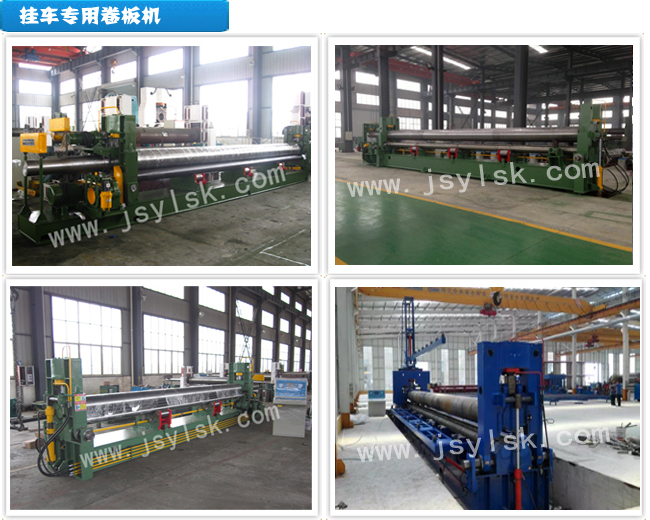 该机上辊可以垂直升降又可以水平移动,垂直升降为液压传动,通过液压缸内的液压油作用活塞杆而获得水平移动通过涡轮蜗杆箱、涡轮蜗杆、丝杆丝母机构传递扭矩,带动上辊的水平移动,下辊只作旋转运动为卷板提供扭矩,下辊下部设有托辊并可调节,上辊呈鼓形状,提高制品的直线度。适用于挂车各种截面形状罐体的卷制。