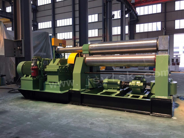 该机结构型式为三辊对称式,上辊在两下辊中央对称位置作垂直升降运动,通过丝杆丝母蜗杆传动而获得,两下辊作旋转运动,通过减速机的输出齿轮与下辊齿轮啮合,为卷制板材提供扭矩。