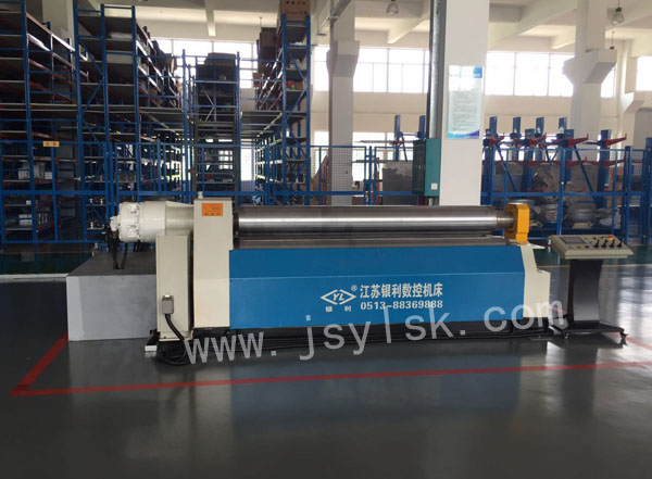 该机结构型式四辊式,上辊为主传动,通过减速机的输出齿轮与上辊齿轮啮合,为卷制板材提供扭矩;下辊作垂直升降运动,通过液压缸内的液压油作用于活塞而获得,以便夹紧板材,为液压传动;在下辊的两侧设有侧辊并沿着机架导轨作倾运动,通过丝杆丝母蜗轮蜗杆传动;该机优点是板材端部预弯及卷圆可以在同一台设备上进行。