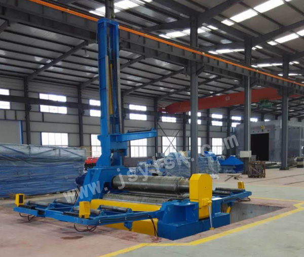 该机结构型式四辊式,上辊为主传动,通过减速机的输出齿轮与上辊齿轮啮合,为卷制板材提供扭矩;下辊作垂直升降运动,通过液压缸内的液压油作用于活塞而获得,以便夹紧板材,为液压传动;在下辊的两侧设有侧辊并沿着机架导轨作倾运动,通过丝杆丝母蜗轮蜗杆传动;该机优点是板材端部预弯及卷圆可以在同一台设备上进行。