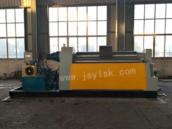 该机结构型式四辊式,上辊为主传动,通过减速机的输出齿轮与上辊齿轮啮合,为卷制板材提供扭矩;下辊作垂直升降运动,通过液压缸内的液压油作用于活塞而获得,以便夹紧板材,为液压传动;在下辊的两侧设有侧辊并沿着机架导轨作倾运动,通过丝杆丝母蜗轮蜗杆传动;该机优点是板材端部预弯及卷圆可以在同一台设备上进行。