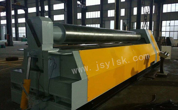该机结构型式四辊式,上辊为主传动,通过减速机的输出齿轮与上辊齿轮啮合,为卷制板材提供扭矩;下辊作垂直升降运动,通过液压缸内的液压油作用于活塞而获得,以便夹紧板材,为液压传动;在下辊的两侧设有侧辊并沿着机架导轨作倾运动,通过丝杆丝母蜗轮蜗杆传动;该机优点是板材端部预弯及卷圆可以在同一台设备上进行。