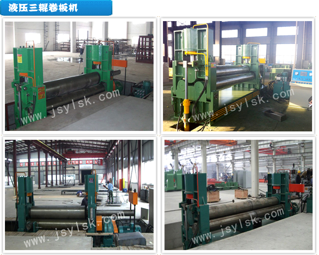 该机结构型式为三辊对称式,上辊在两下辊中央对称位置作垂直升降运动,通过液压缸内的液压油作用于活塞而获得,为液压传动,两下辊作旋转运动,通过减速机的输出齿轮与下辊齿轮啮合,为卷制板材提供扭矩。